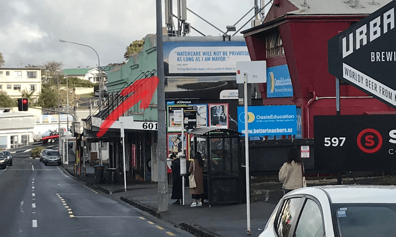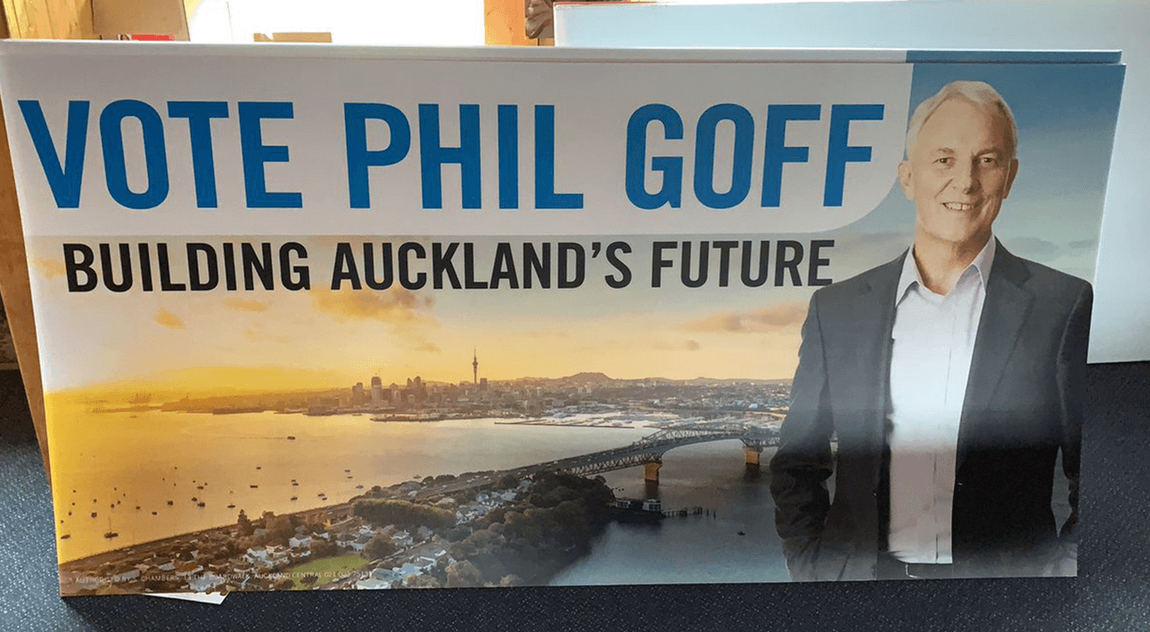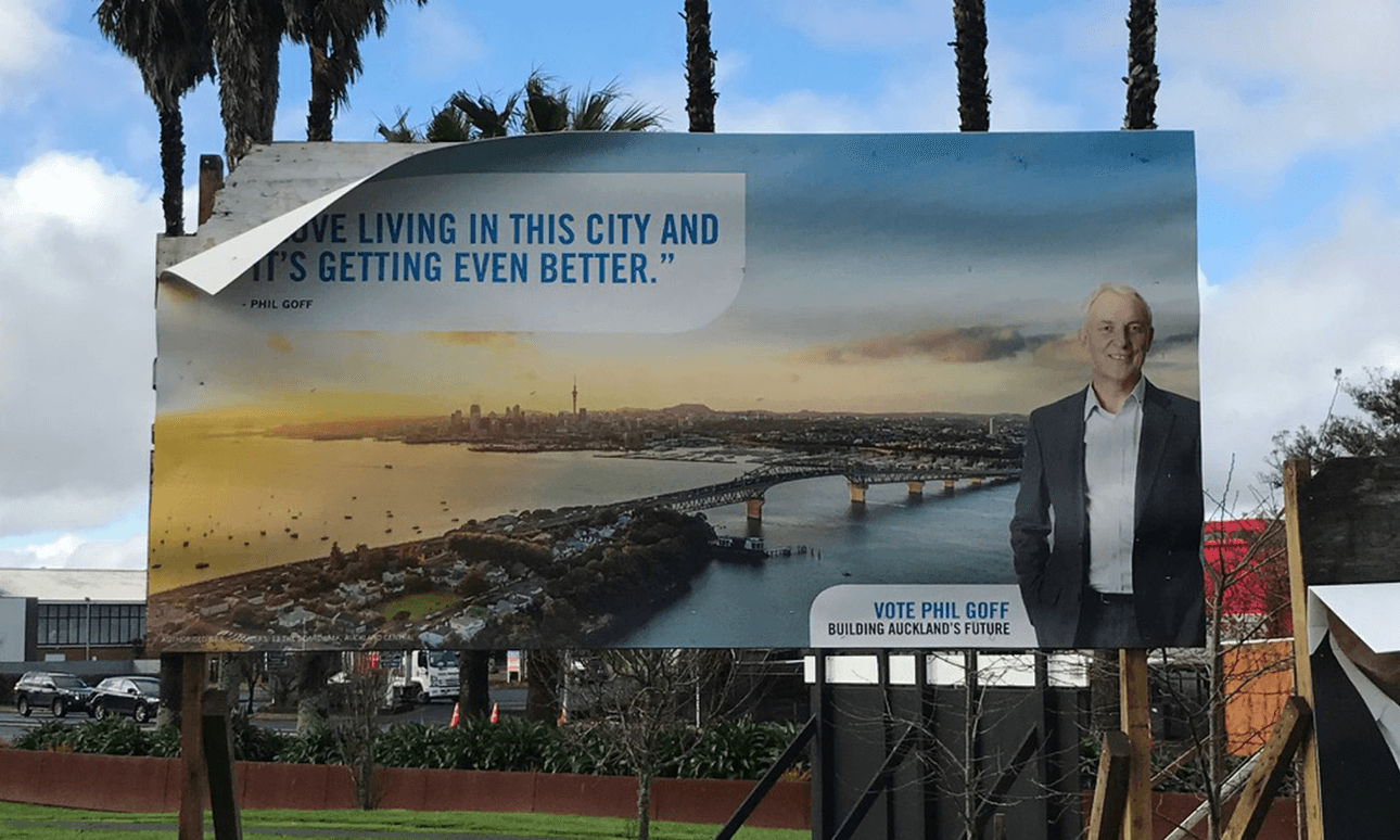 In some instances, you literally can’t see him. For example, there’s a billboard right above John Tamihere’s campaign HQ, which is a genius flex, but as cars drive towards it down New North Rd the placement of mini-Goff in the far corner means you don’t see him until you’re very close, and the headline is way too long to read from a moving car.