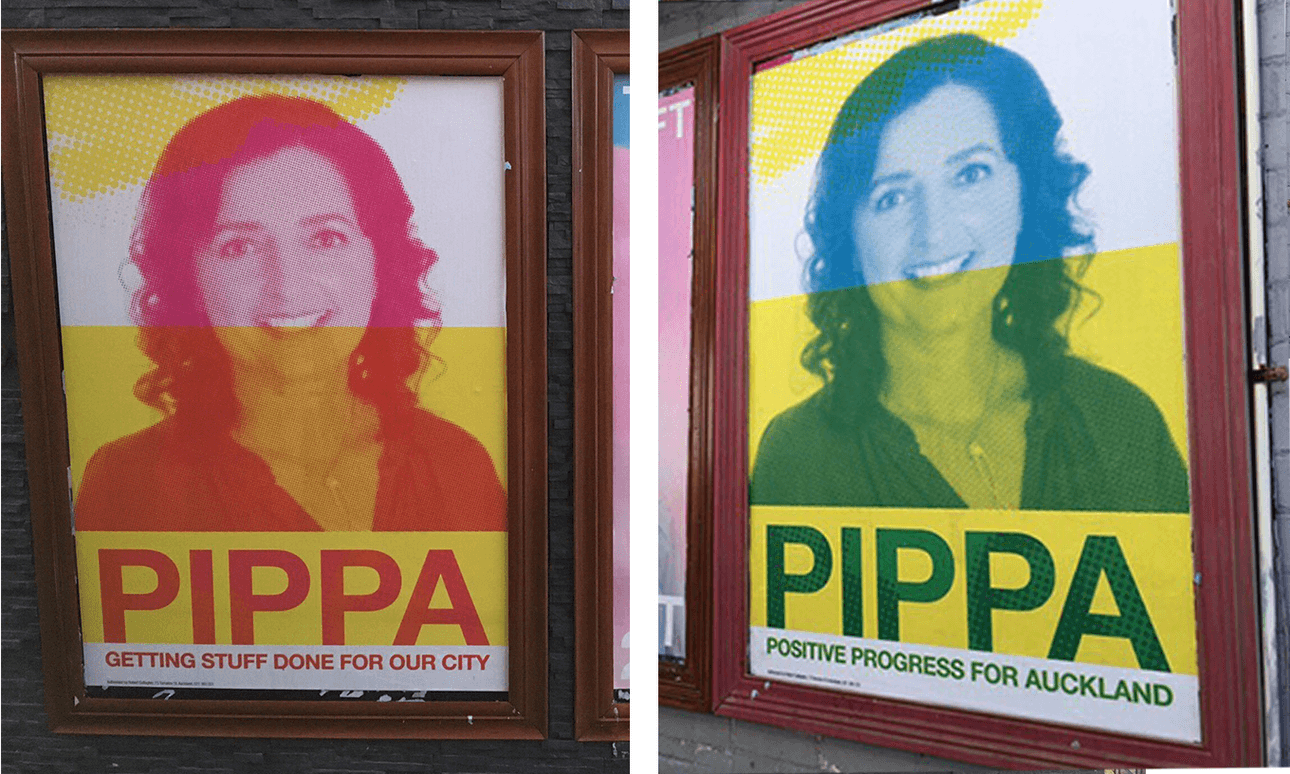 My other favourite from Auckland are these posters for Pippa Coom. It’s a bold move to only put the first name, and they’re more arty and highbrow than your usual election sign, but they’re bright and fun and will appeal to a certain younger crowd which I’m guessing is the plan.