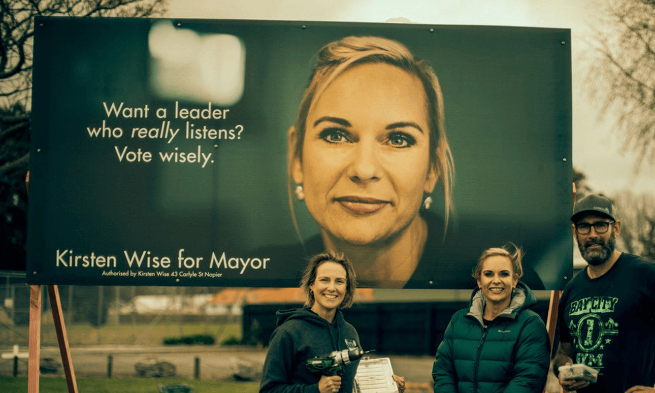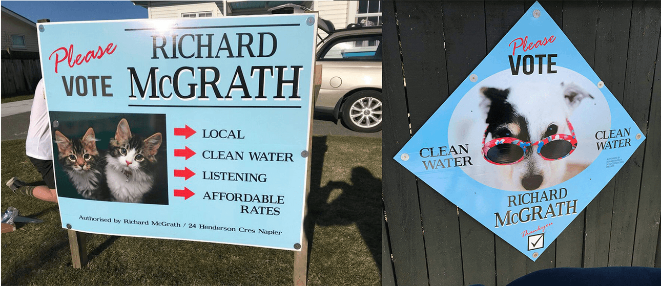 Speaking of breaking the rules, these signs are on their own planet, and that’s great. According to RNZ senior reporter Anusha Bradley, who sent me these, when Napier City Councillor Richard McGrath was asked why he used kittens, he said: “who wants to see another suit-wearing councillor on a billboard?”