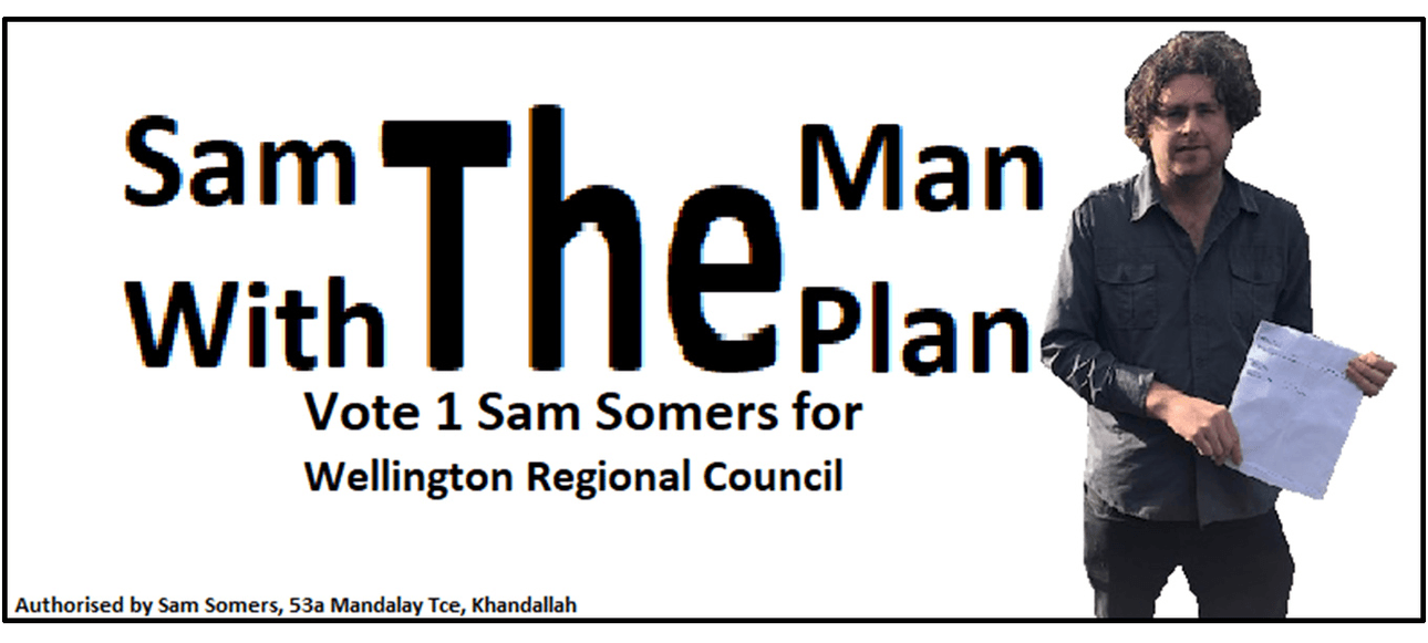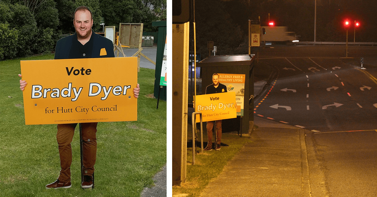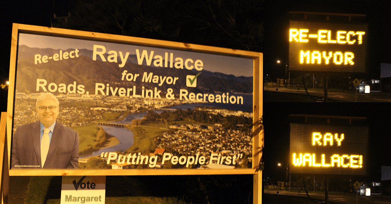 This, on the other hand, for incumbent Lower Hutt mayor Ray Wallace, is total amateur hour. The layout is a mad jumble, the generic default font looks like it has been thought about for a total of four seconds, and the whole thing looks like it’s been created in Microsoft Word. Luckily for us, Ray hasn’t stopped there. He’s also using the kind of roadside light up sign that’d usually indicate roadworks or a flood, and you might even assume is owned by the council. Is this legal? It seems fishy to me.
