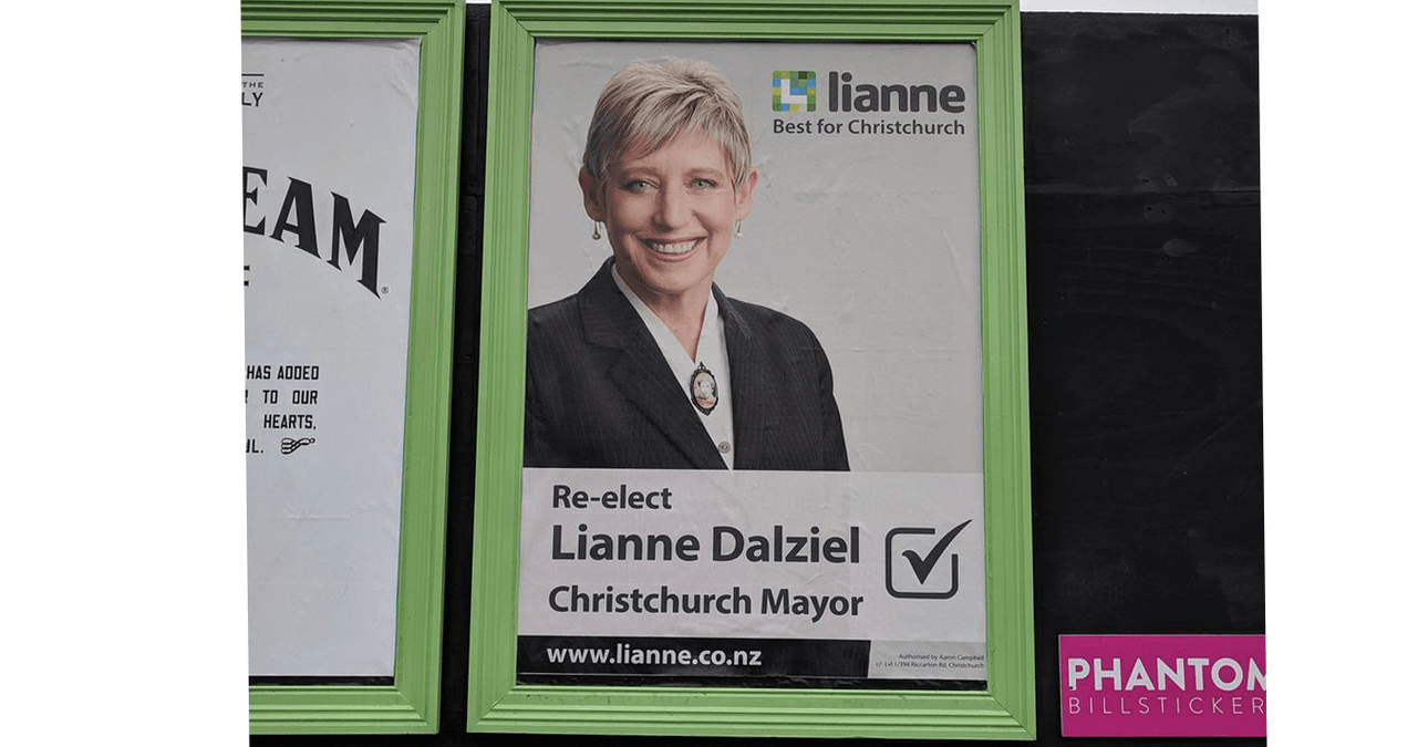 I don’t know much about Christchurch local politics but I get the impression Lianne Dalziel is pretty firmly established as mayor. These posters give off a confident, comfortable vibe like she isn’t too stressed about it. The typography is pretty run of the mill, but of interest is her campaign logo in the corner – the lower case lianne is surprisingly casual and informal, with an L that looks alarmingly like a learner driver sign. Surely she’s on her restricted by now.