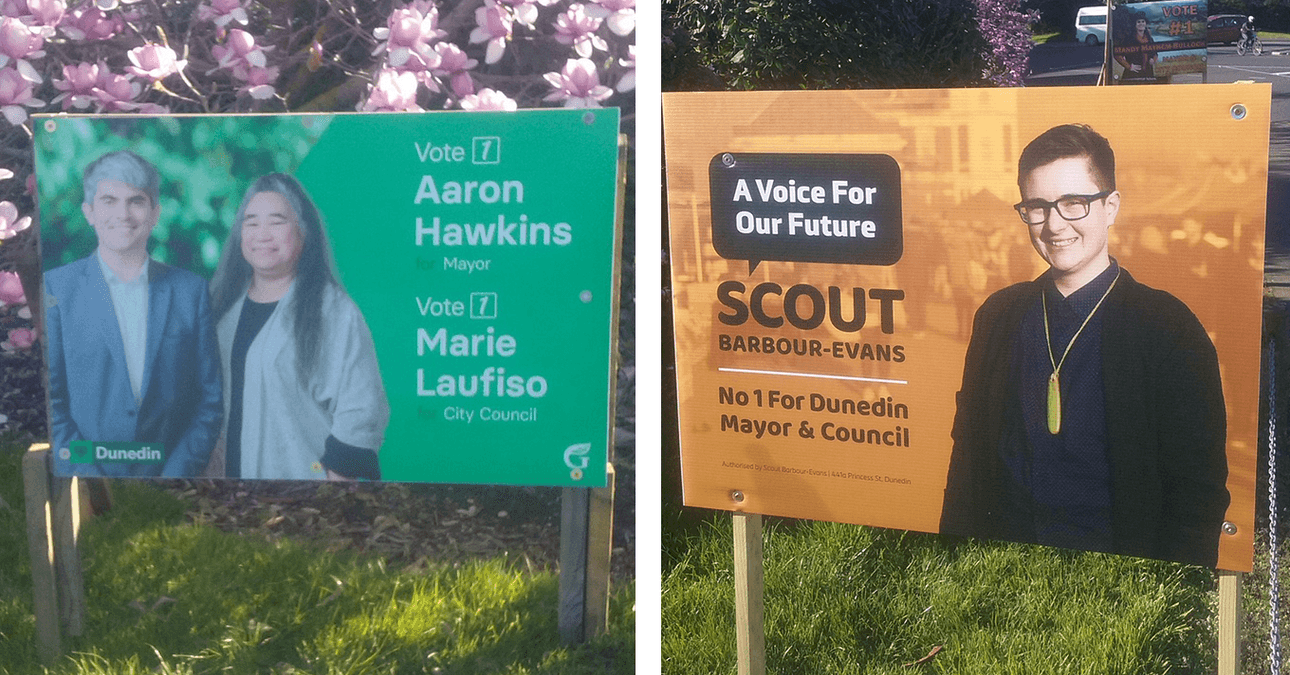 My friend James sent me a big set of Dunedin signs, and these are ones that most caught my eye. Aaron Hawkins and Marie Laufiso is the rare example of using straight up political party branding, for better or worse depending on your feelings on the Greens. I think it’s neat and friendly if a little safe, but I really like the very Greens touch of being economical with resources by sharing the sign.