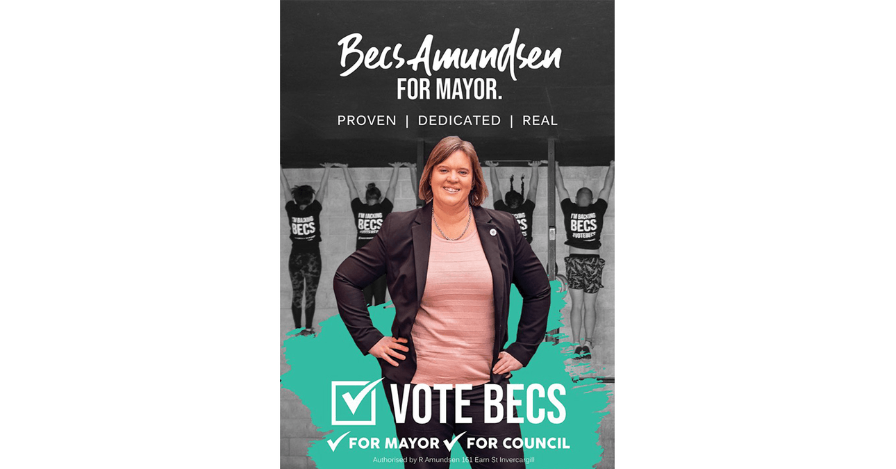 OK, last one. Invercargill has arguably the most famous mayor in New Zealand, so I guess anyone who tries to come for the king better be ready to really shake things up, to mangle a metaphor in the style of Sir Tim Shadbolt. There’s a lot going on here in Becs Amundsen’s poster – several different fonts, more hands on hips and even a splash of teal paint – but the scene stealer is the background. Seriously, what is going there? It looks like she is running some kind of Abu Ghraib torture camp. Is that what she’s planning to do to Sir Tim?