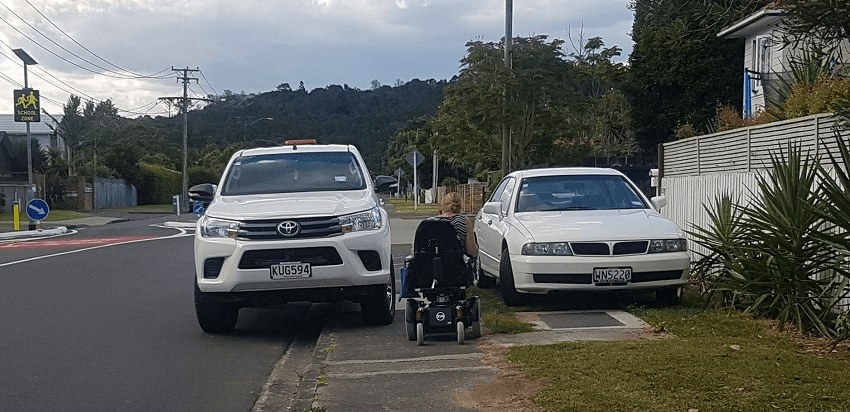 There are many more examples (see below) of these kind of misplaced priorities in our walking network – the network women are mostly using. It’s important to note that women are still more likely to be the primary caregivers for children and seniors. And women are living longer than men in Aotearoa. Try pushing a pram onto this pedestrian bridge, or down this footpath. Try doing it in a wheelchair, or with a walking frame. It’s important to note that most men wouldn’t feel comfortable using this infrastructure, let alone people with prams, walkers and wheelchairs.