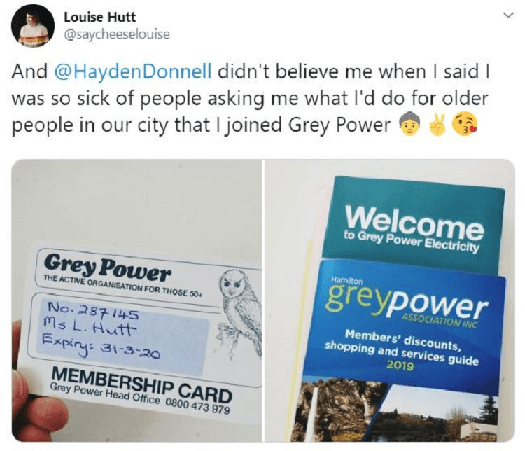 Fellow Hamilton candidate Louise Hutt came up with one of the election’s best political innovations. When Hutt, 26, got tired of being asked what she’d do for old people, 65-115, she decided to quiet the critics by joining Grey Power. It turns out the organisation doesn’t have an age limit. Hutt’s membership card recently arrived, and with it the rebuffed silence of those who doubted her commitment to the elderly.