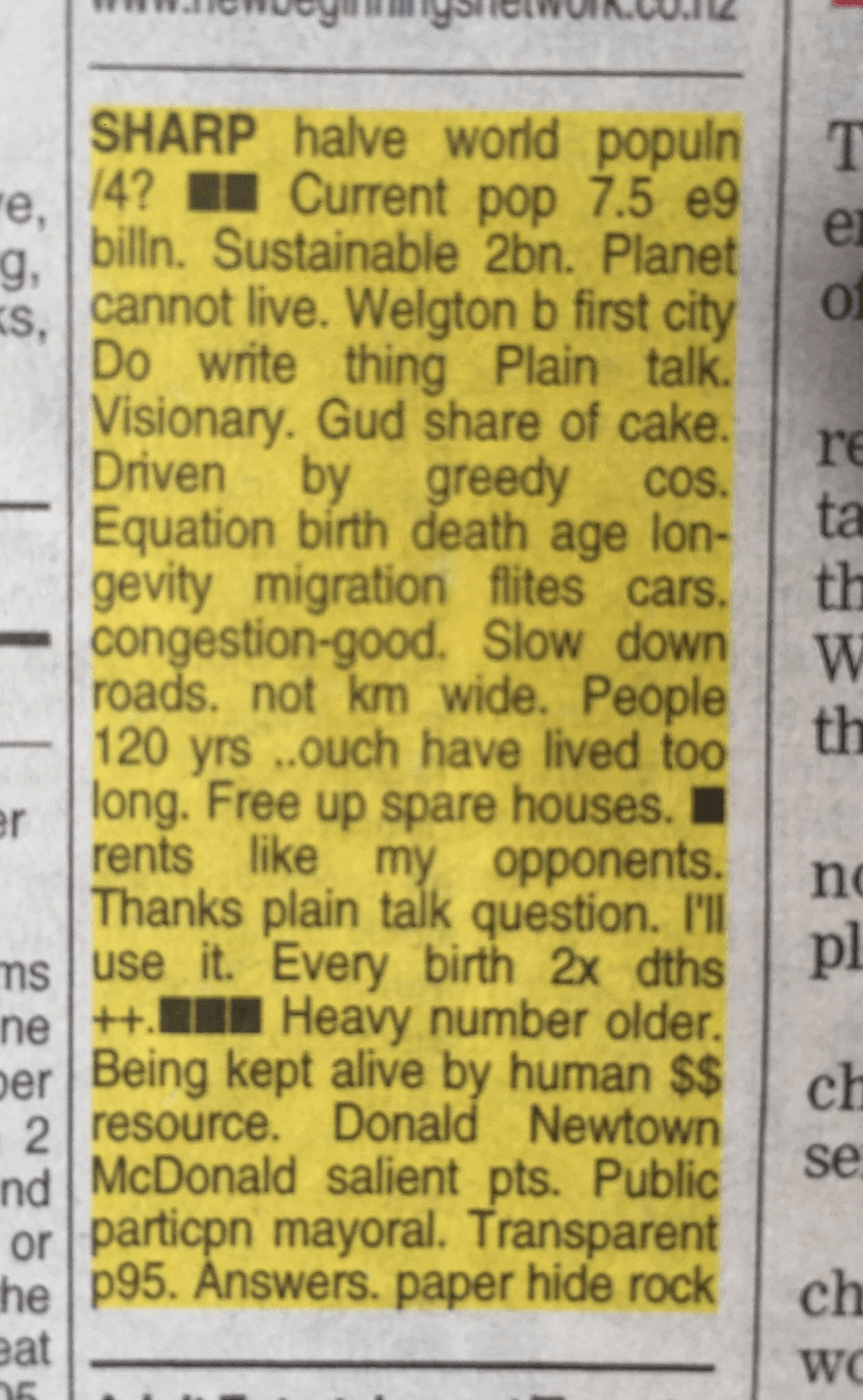 A Wellington letter writer proposed a two-deaths-for-every-birth policy