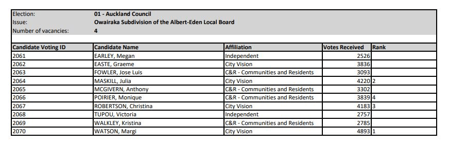 2.21: And another one for the Auckland Council – Christine Fletcher and Cathy Casey look like they’ve both been re-elected in the Albert-Eden-Roskill ward.