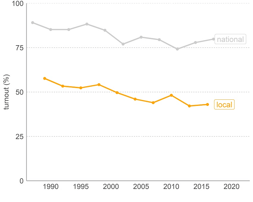 As the graph shows, voter turnout in local elections is consistently 30-odd percent lower than for general elections. It’s getting worse too, reaching a new low in 2013 and 2016 at just over 40 percent. If fewer than half of enrolled voters bothered to show up for a general election (let alone five elections in a row), people would say our democracy was in crisis. They would be right.