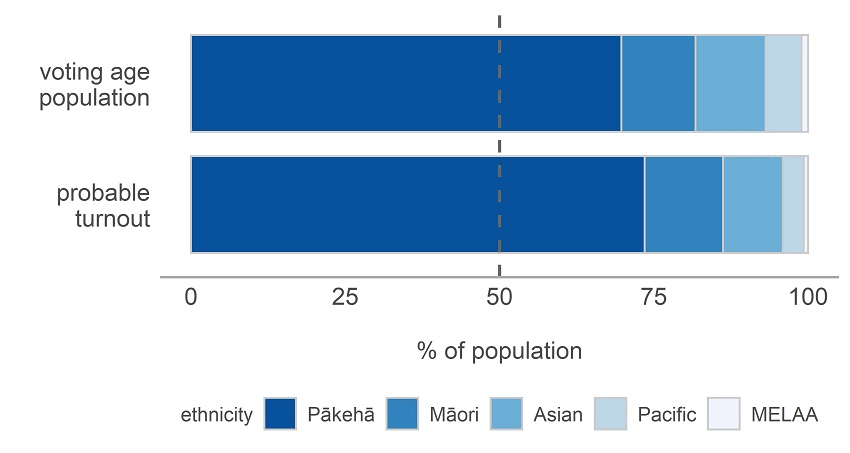 The impact of low voter turnout depends on who isn’t turning out. Research by Local Government New Zealand shows that it’s mostly young people: 18-24 year olds are less than half as likely to vote as people aged 65 and over. This youngest age group also accounts for nearly half of the eligible voters who weren’t enrolled by July 31st. The graph below shows the mismatch between the age split of eligible voters and those who actually turn out to vote. If 2016 voting patterns are repeated this year, almost half of those who vote will be 55 or older – despite the median eligible voter being in their mid-40s. And there’s a similar, though less extreme mismatch with ethnicity – in 2016, Māori and Pākehā voted more, and other ethnic groups voted less.