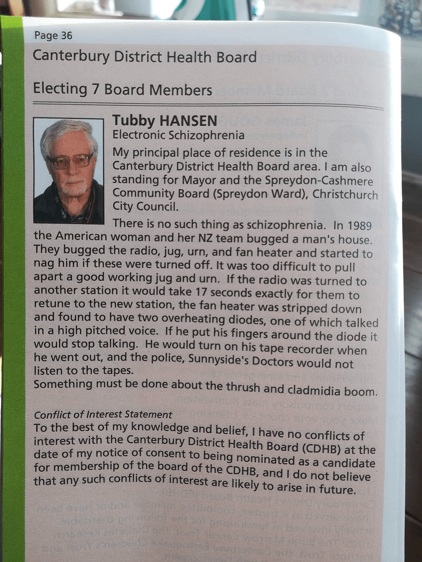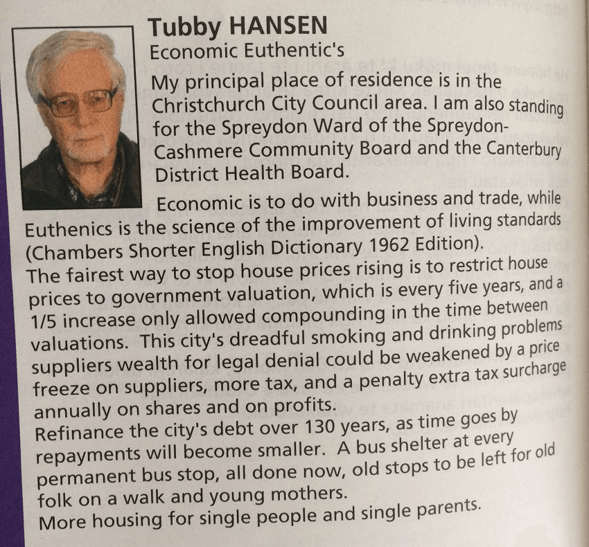 Tubby Hansen has run in every Christchurch local election since 1971. His resilience is impressive, but his literary craft is legendary. Every three years, Hansen releases candidate blurbs which are, by turns, evocative, avant-garde, cryptic and compelling. If these works were on Reddit and signed ‘Q’, they’d be the foundational documents of a massive online cult. Instead, they’re marooned in the world’s least likely repository for cutting-edge writing, often appreciated only as a curiosity to skim before turning the page to another rant on rates policy.