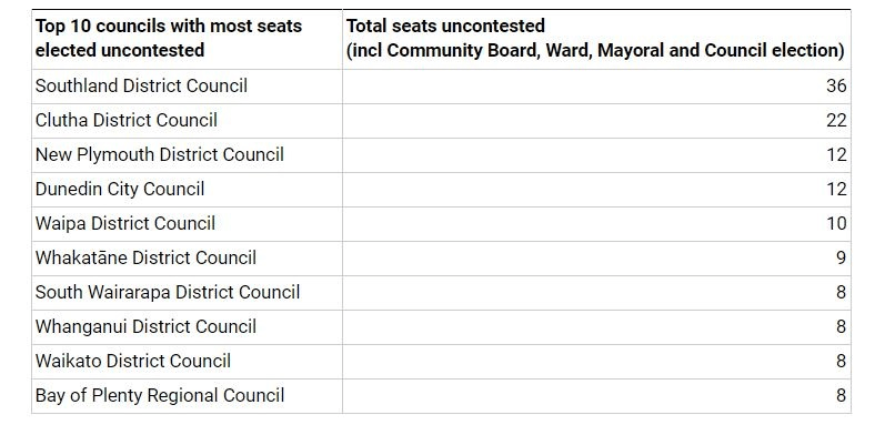 Many of the most unappealing council races were in the lower South Island, with 70 of the uncontested seats clustered in Southland District Council, Clutha District Council and Dunedin City Council.