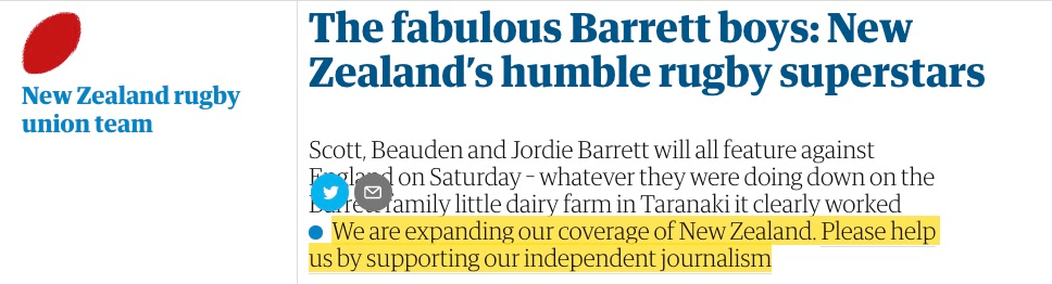 Already, stories with strong New Zealand links carry a targeted call-to-action: “We are expanding our coverage of New Zealand. Please help us by supporting our independent journalism”, reads a note above New Zealand themed stories.