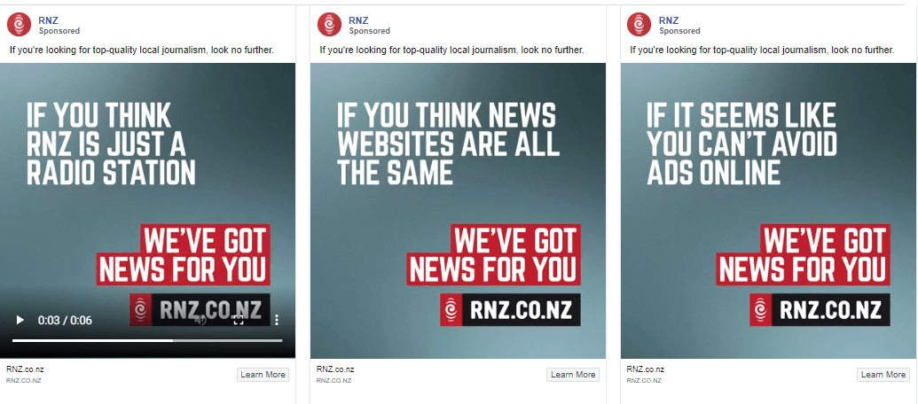 RNZ has launched a new brand campaign which takes explicit aim at its commercial competition, attacking both advertising-funded and paywalled news sites. The campaign is running on out-of-home media and as paid posts on Facebook, and has drawn incredulous responses from news executives in the private sector media, which has been dealing with well-documented difficulties due to the dominance of the digital advertising market by Facebook and Google.