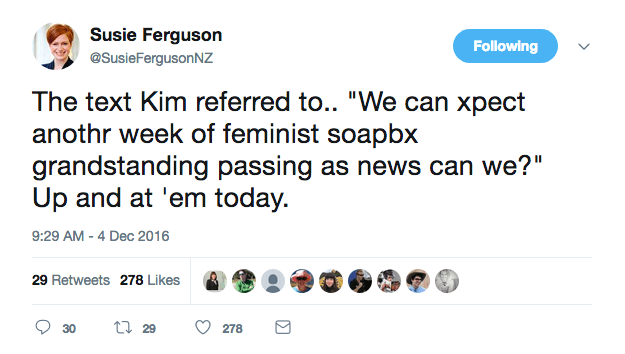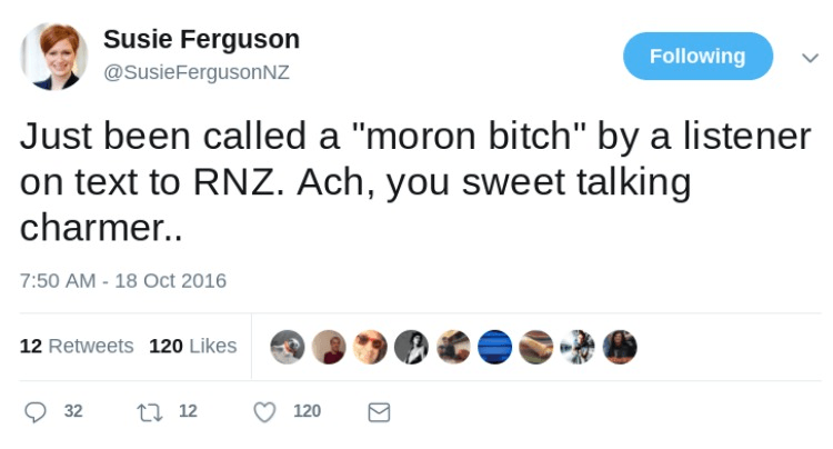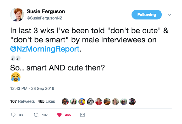 In one tweet Susie Ferguson posted about gendered comments she’d got at work, she recounted being told “don’t be smart” and “don’t be cute” by interviewees. “So… smart AND cute then?” Ferguson joked, in a tweet that went viral by New Zealand standards.