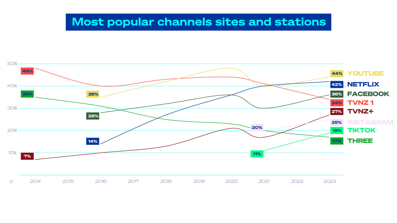 Everyone else is already there, with a strikingly even distribution among SVOD (paid streaming, where Netflix remains incredibly dominant), on-demand like TVNZ+, and social video sites, mostly YouTube. It means that the traditional motherlode audiences of primetime TV just don’t last like they used to – we become a much more splintered audience, watching tens of thousands of different niche pieces of content across myriad channels.