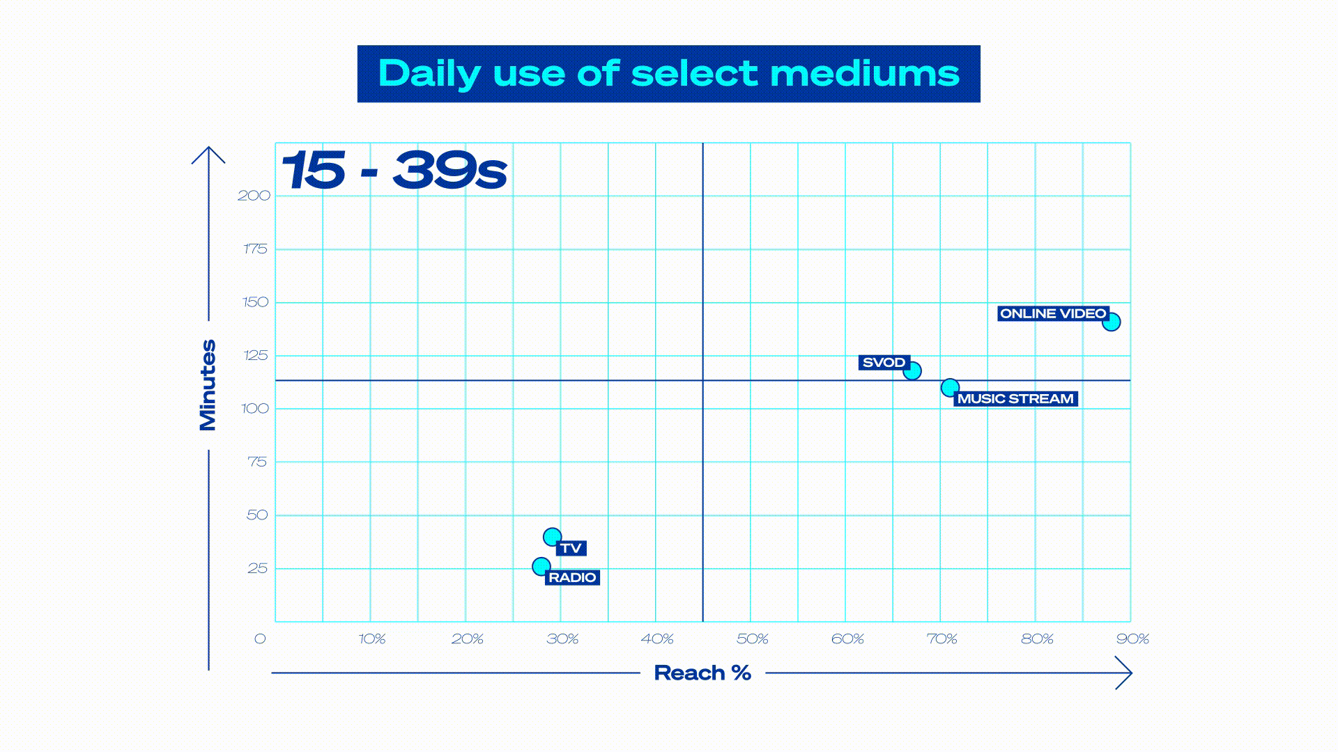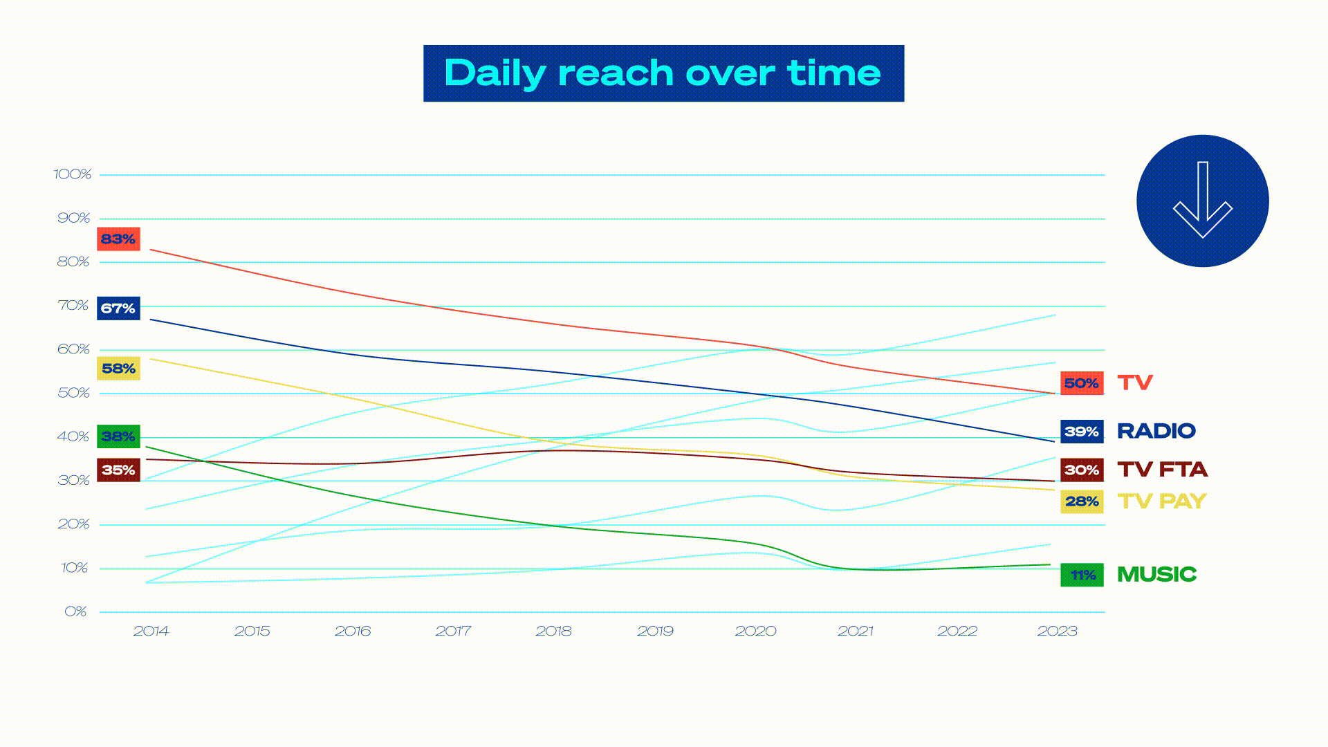 Radio has a well-earned reputation as the cockroach of media, thanks to its inclusion as default entertainment in cars. However, the steady rise of public transport and inclusion of CarPlay and Android Auto in more modern cars mean increasing amounts of choice. The biggest impact, though, is the rise of streaming for music consumption, which is now up to 50% daily usage. A pair of shocking statistics: almost as many people use Spotify every day (33%) as listen to radio (39%, down from 67% in 2014), and streaming music has even overtaken radio in the crucial morning segment. Even the reach of podcasts, at 17% and still rising, is starting to gain on radio, particularly for young people, where the gap is now just 5%.
