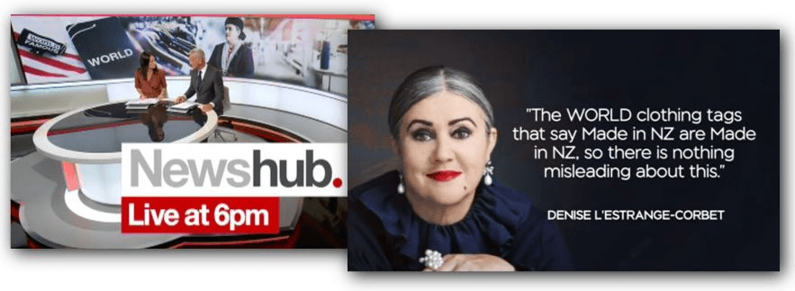 That the words “Fabrique en Nouvelle Zelande” printed on the tag attached to the T-shirt referred not to the T-shirt but the tag itself. “The WORLD clothing tags that say Made in NZ are Made in NZ, so there’s nothing misleading about this,” she said.