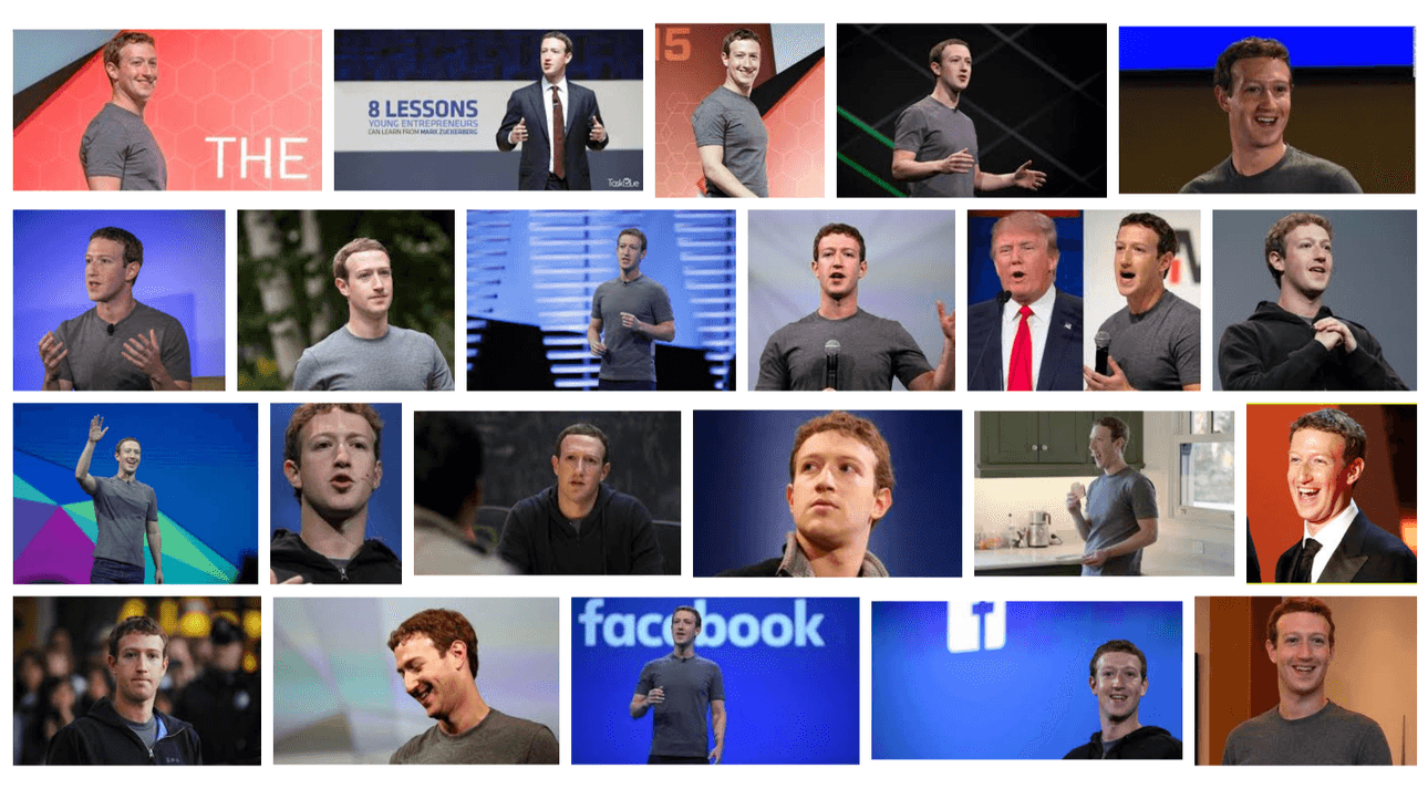 Mark Zuckerberg has a uniform: dark jeans and a plain grey t-shirt. An image search for the Facebook founder returns row after row of dark heather gray crewnecks, with the occasional hoodie or suit thrown in for variety. The visual sameness of Zuckerberg’s dress code is amplified by the fact that he is most often photographed against low-context backgrounds like conference stages, boardrooms, and slick corporate slide decks. Together, outfit and setting conspire to turn a specific person — Mark Zuckerberg, aging wunderkind — into an icon and a cypher. His boring consistency performs a sleight of hand that lets him, and his actions, hide in plain sight.