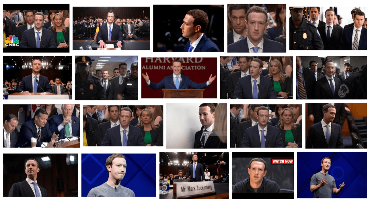 In the history of Zuckerberg photography, images from the Congressional hearing feel uniquely weird. Roland Barthes talked about the “punctum”, a photographic moment or an object within a photograph that “rises from the scene, shoots out of it like an arrow, and pierces me”, puncturing the surface of the photograph with poignant specificity. It might be a torn shoe, an unusual glance, or an off-center figure — anything that hits the viewer with an unexpected pop. The punctum collapses the distance (of time, of space) between viewer and photograph, forces a portal between the two through which an affective state flows. Zuckerberg’s testimony to congress provides a sort of punctum in the photographic record. Scrolling through pages of image search results, the grey-clad timeless Zuck photos are intersected here and there by a boxy suit, a background scrum of congresspeople. For a second, Zuckerberg is time-bound and dreadfully immanent, and the viewer might think, for a second, to feel sorry for him.