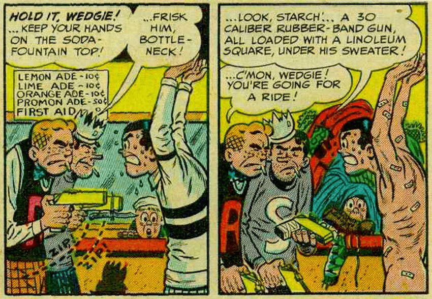 Perhaps the most lacerating of early Mad parodies was ‘Starchie’, which reimagined wholesome Archie Andrews as a switchblade-carrying, liquor-swigging juvenile delinquent. In Eisenhower’s America, this was potent stuff. Mad was an instant hit, inspiring dozens of copycats.