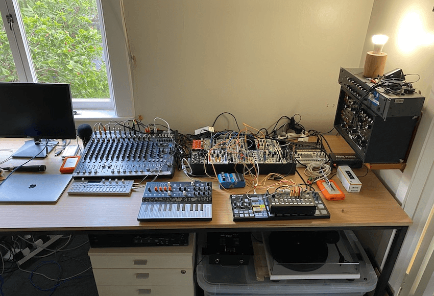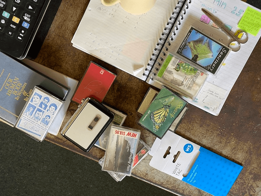 At lunchtime during the first bitterly cold streak this winter, I headed across the Auckland Harbour Bridge to Pilbrow’s home studio. Bradley sat on a daybed and idly sorted through a folder of imagery, Pilbrow sprawled on a swivel chair next to speakers, a monitor and a dinky little keyboard. Between the two sat a low table with some of Pilbrow’s op shop cassettes on it – Creatively Managing Pain, Sanctuary by Ana and Norval Williamson. Beyond that a table covered in mixing desks, keyboards, pedals and hard disks. Below that, more gear. Everywhere the detritus of musical life.
