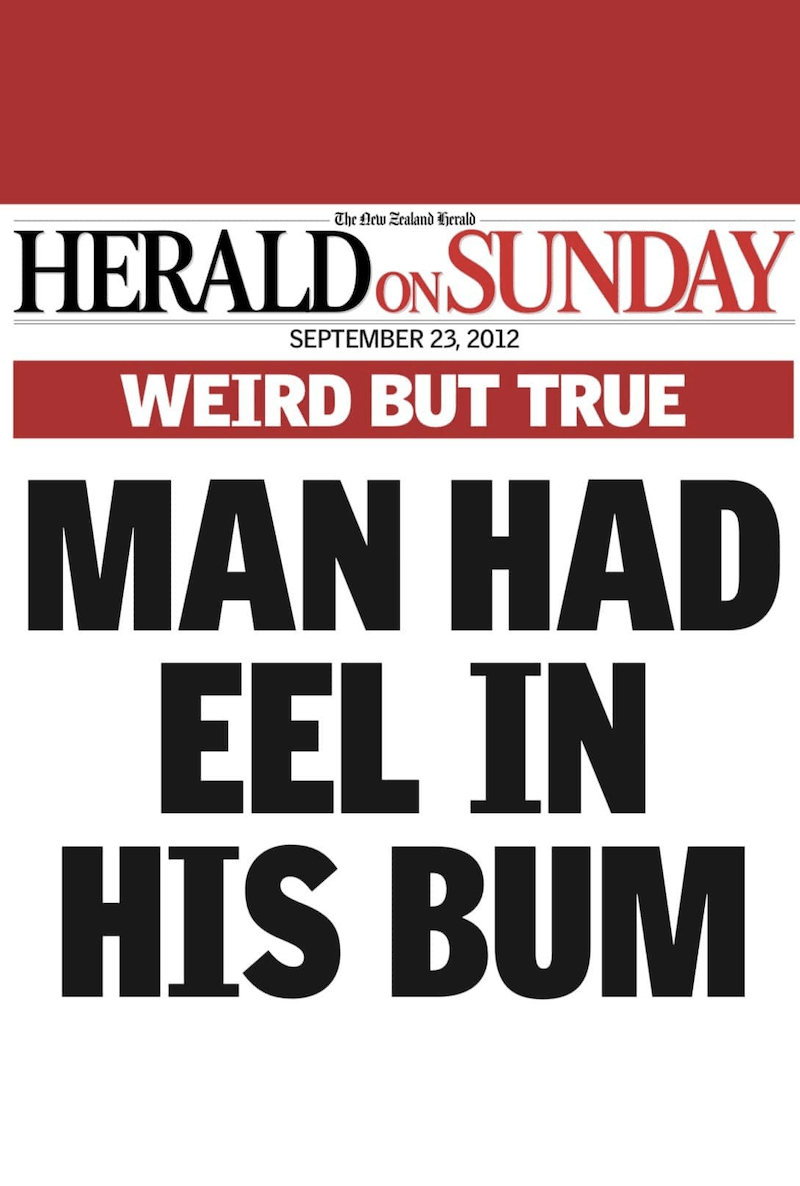 The Herald on Sunday’s 2012 story about a man with an eel in his bum is perhaps its most singular and well-read contribution to New Zealand journalism. It’s notable first and foremost for being centred on a man who had an eel in his bum. But it also contains four of the most memorable lines in our media’s history. The first is the headline above, which went out for display at dairies and newsagents around the country. “Man had eel in his bum” is striking, and still more so for the decision to go with the word “in” rather than “up”. The terminology is somehow both more dispassionate and precise, and yet far more confronting and unsettling.