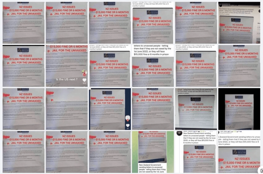 Typed beneath Ministry of Health letterhead, the message makes the baseless claim that the Covid-19 vaccine will become mandatory across New Zealand on June 1. In fact, the opposite is true – vaccine mandates were never universal and are on their way out, with most scrapped early last month. In many hundreds of social media posts viewed by The Spinoff across Twitter, Facebook, Reddit, YouTube and Telegram, the letter is presented with superimposed red type that falsely states, “NZ ISSUES $15,000 FINE OR 6 MONTHS JAIL FOR THE UNVAXXED.”