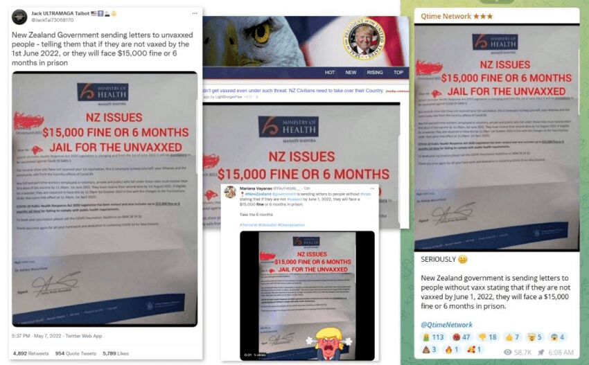 A tweet from an “UltraMaga” account that included a photograph of the false letter and wrongly claimed “New Zealand Government sending letters to unvaxxed people telling them that if they are not vaxed by the 1st June 2022, or they will face $15,000 fine or 6 months in prison”, had as of last night been shared more than 7,000 times, which translates into hundreds of thousands of views. It is hard to miss on Telegram, where those propagating the disinformation include the “Qtime Network”, in a post that has been viewed more than 70,000 times.