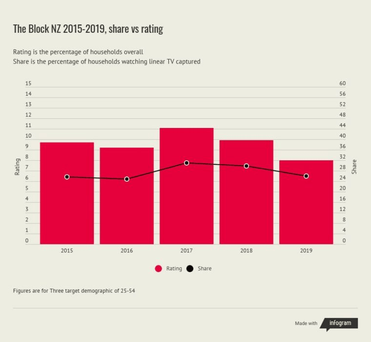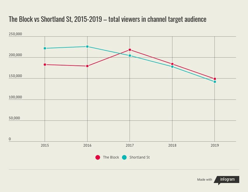 I asked Three and TVNZ 2 for five years worth of ratings for The Block and Shortland St, and have combined that information into two graphs. There are a few important caveats, which I’ll go through at the conclusion, but the key thing to note is that all the below figures are averaged across the full series that year – thus 2019 is a work in progress.