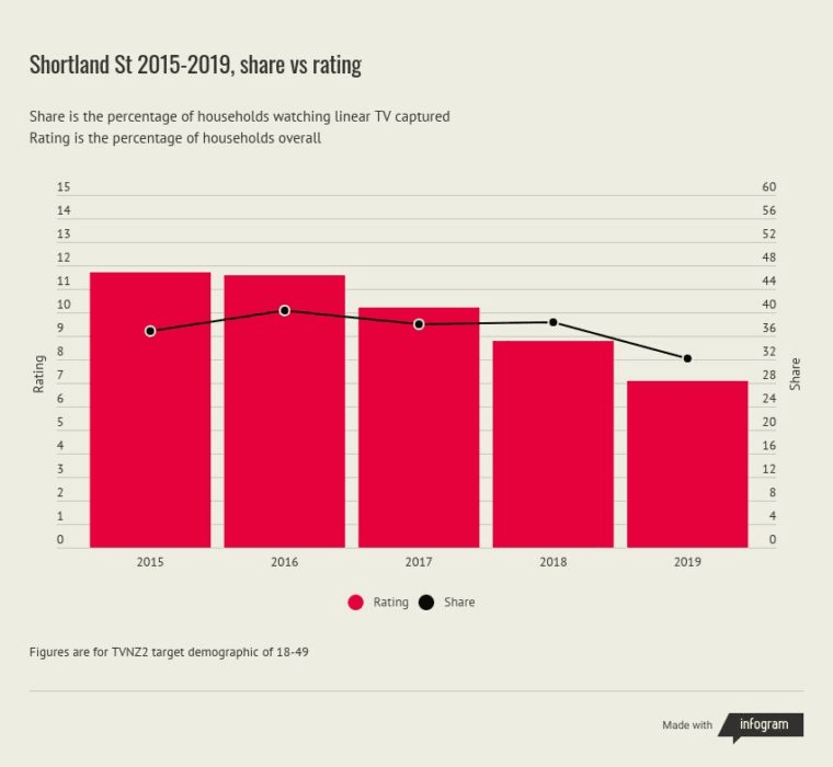 The fate of Shortland St is worth looking at in detail via the two other key metrics, in share and rating. It’s worth underlining the meaning of these seemingly synonymous terms, as their decoupling tells a story of its own. Rating is the audience size as a percentage of the total potential audience. So, if there were 1m people who could theoretically be watching, how many did. Share is the audience size as a percentage of those who were watching television at the time. What we see is that the decline in share is nowhere near as pronounced as the decline in rating – meaning that while Shortland St has struggled with its ratings since the iconic 25th anniversary in 2017, the bigger problem is of the total proportion of people watching linear television is declining.