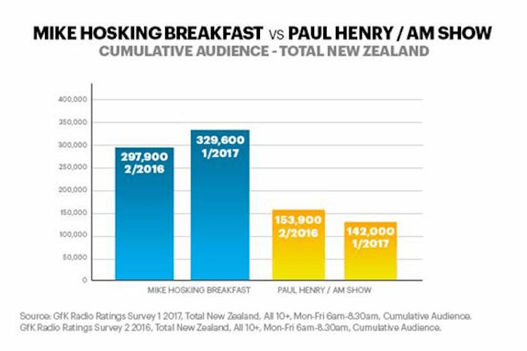 5. The most intense battle is for the hearts and minds and brains of the morning news listener – particularly in an election year. NZME and its reported $1.2 million man Michael Noel James Hosking earned his money by growing his breakfast audience from 297,900 to 329,600. The network released a graph razzing Duncan Garner’s AM Show for dropping around 10,000 listeners from the Paul Henry days – which actually seems pretty small, given what we are repeatedly told about Henry’s starpower.
