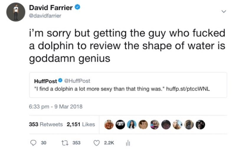 I suppose in The Shape of Water, both parties were consenting, so everything felt morally OK. And that’s always been your thing, right? That the dolphin initiated sex with you, not the other way around?