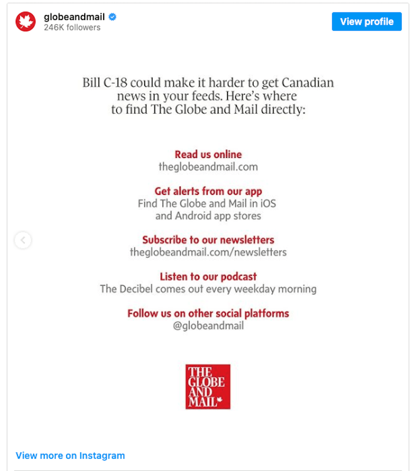 If I barely noticed a change, I wonder if the average Canadian even notices what’s missing. In response to a screenshot I shared, showing how I couldn’t access the national newspaper, The Globe and Mail, on Instagram, one friend responded “??? Why?”