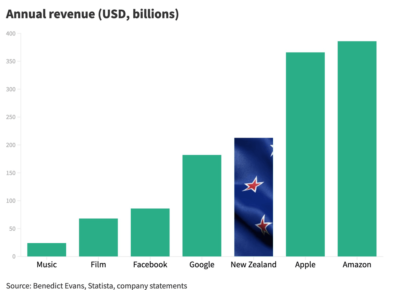 Whether you are horrified or pleasantly surprised by this comparison of NZ’s GDP to tech revenues may depend on individual psychology. On the one hand, there are the twin towers of Amazon and Apple towering over a nation-state of five million people. On the other, as big as big tech is, one small country is up there with the best of them.