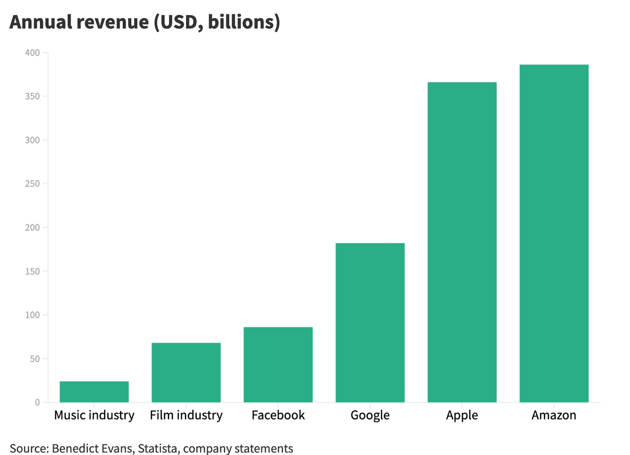 That’s the entire global revenue of the recorded music industry and the film industry against the revenues of four individual US tech companies. The music and film industries used to be prime movers in creating culture. They are now small fry compared to the digital platforms.