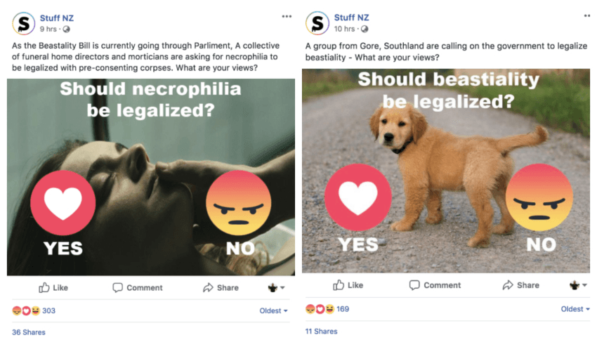Over the weekend, NZ Stuffed’s output included a few reaction polls. They were very similar to reaction polls that Stuff do in fact run regularly. The major cosmetic difference was the lack of a checkmark to indicate a page had been authenticated, and a slight bleed at the bottom of the logo.