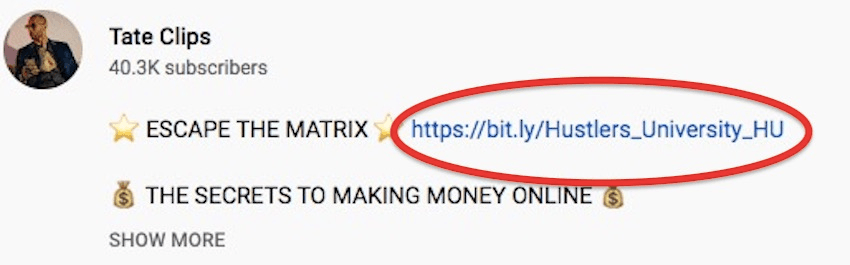 Tate now runs an enterprise called Hustlers University where he teaches men – sorry, soldiers – how to be hustlers for just $49 a month. The Hustlers University Discord currently has over 140,000 members, largely aided by a scheme that rewards affiliates with 50% the fee for new sign-ups. Sound familiar? Sound… pyramid-ish? When he’s not being the Chancellor of Hustlers University, Tate appears to spend a lot of time smoking cigars, lying in a big bed, posing with his guns, and guesting on podcasts that have names written in all capital letters.