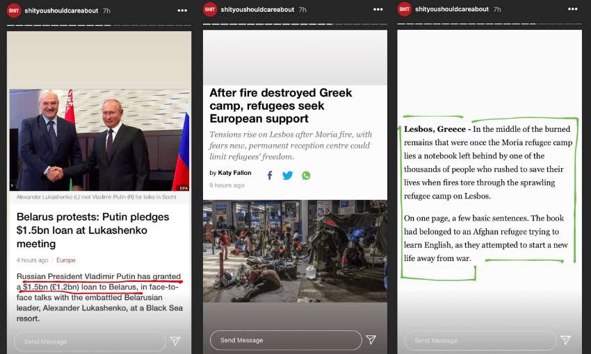 SYSCA’s daily Instagram stories consist of highlighted rundowns from international news sites. At the time of writing, it’s migrant camps in Greece and the Belarus protests.