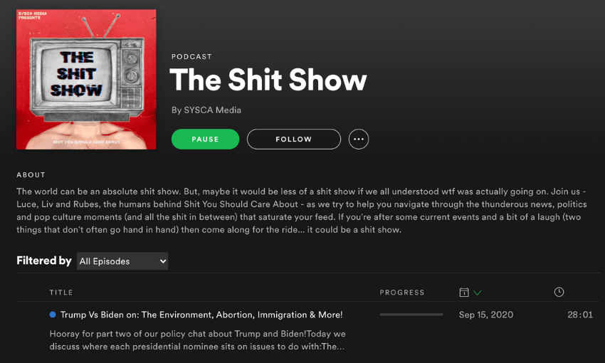 There’s also a podcast, The Shit Show, comprising a collection of pop culture and political summaries – a recent episode asked, “Could you date a Trump supporter?”