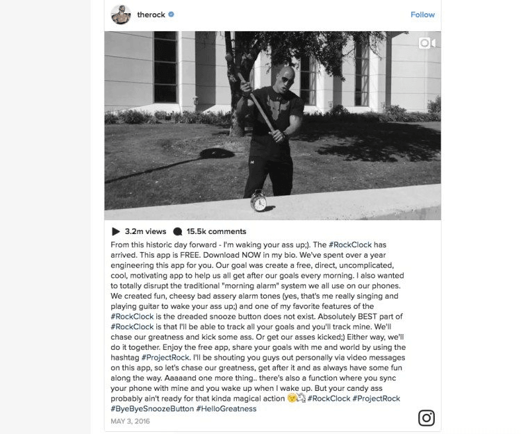 A recent change to the constant stream of gym selfies, fan photos and movie sets, was the release of his new free app The Rock Clock. The Rock Clock is a clock by The Rock that allows you to wake up when his mighty Rockness wakes up. When I downloaded the app for LOLs, “Rock Time” was 4:15am. LOL.