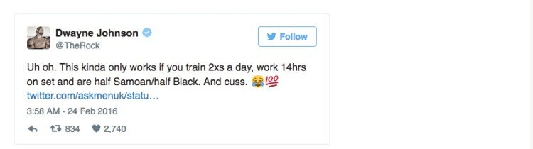 5:00pm The Rock has said he works for 12 hours every day. No way am I telling my boss that I’ll work 12 hours. I’ll go home now as per usual even though I showed up an hour late. This is not sticking with The Rock’s schedule but neither did the rice so we’re even.