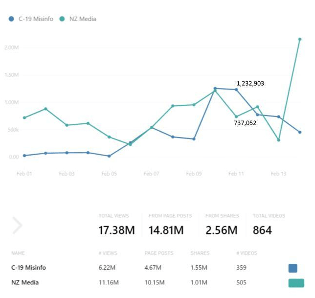 Analysis of Facebook content on the two most tempestuous days of the protest action showed misinformation purveyors outperforming mainstream media in reaching online audiences, the paper found. On February 10, which saw the first arrests as protesters and police clashed, the misinformation pages studied by the Disinformation Project generated 252,917 interactions, while New Zealand mainstream media pages on Facebook clocked up 230,624.