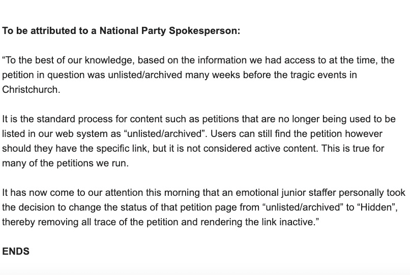 Another example of deletion that was linked to Friday’s attacks was the disappearance of the National Party page pointing to a petition to stop the UN migration pact. The National party told the Spinoff it was wrong that the page had been removed following Friday’s terrorist attack. “As part of our normal web maintenance, pages on our website are routinely archived after the completion of a petition,” said a spokesperson on Sunday. “This petition was started in December 2018 and was archived some weeks ago, well before any of the recent tragic events in Christchurch.”