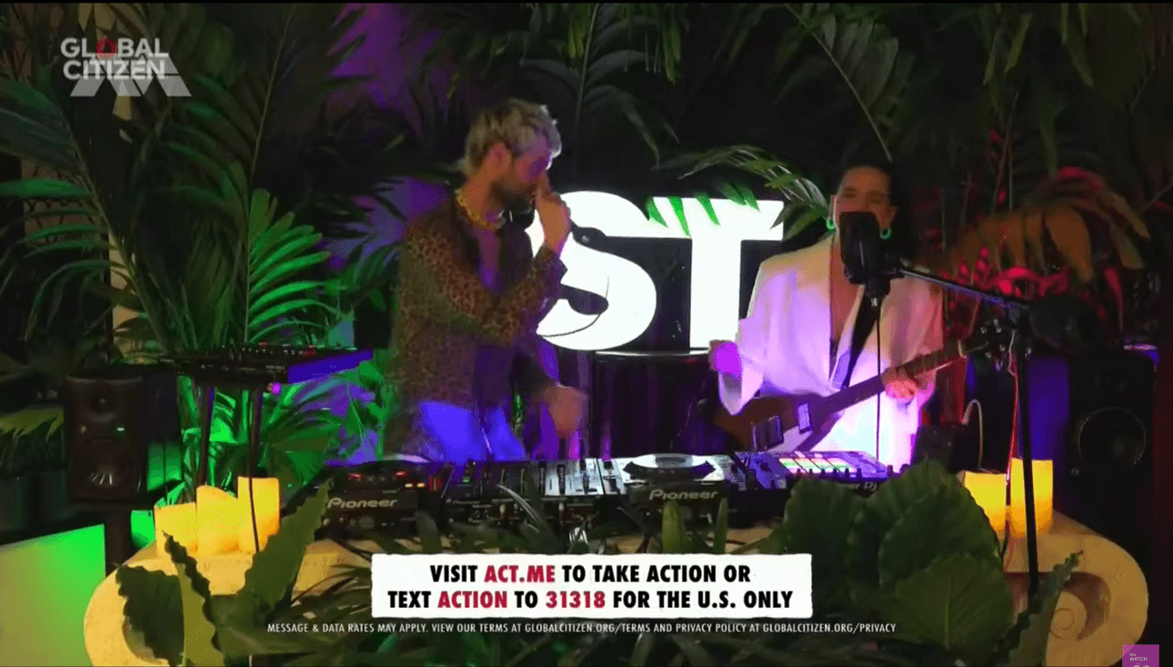 Some acts don’t thrive in these sorts of lo-fi livestream environments. Sofi Tukker, who is not one person, but two people named Sofi and Tukker, are one of those acts. Every second I spend looking at the screenshot brings up more unanswerable questions. Why this act? Why this song? Why… the jungle decoration? The apocalypse is in the post.