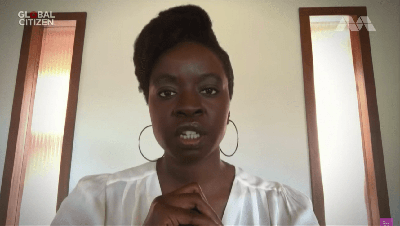 High: Danai Gurira talking to the screen