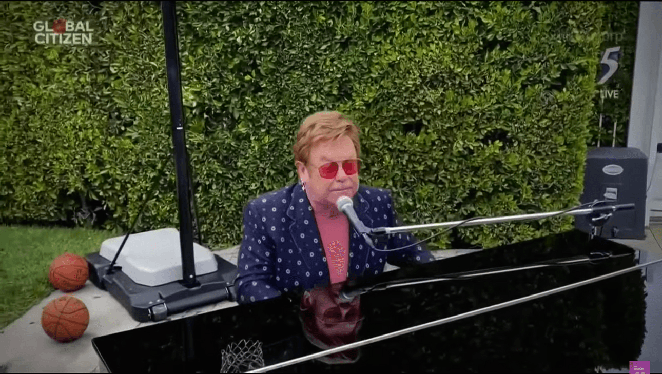 Also, I can’t help but think of the poor bastards who not only had to take one of Elton’s pianos outside, but who also had to, for some reason, set design his outdoor area to put these basketball hoops and balls just so.