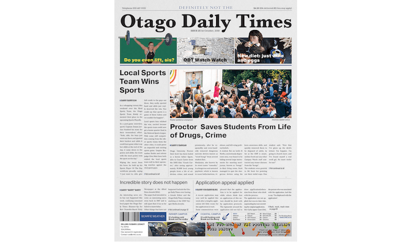 Critic and the Otago Daily Times have an awkward relationship. The ODT loves to shake its old man fist at students for stepping on its lawn, and Critic loves to rip them out for their weird and inane content. I wrote a kinda self-indulgent history of the last twenty years of Critic/ODT relations, and while researching I found a 2003 cover that parodied the front page of the ODT. Figuring that stealing from ourself wasn’t real theft, we copied the concept.