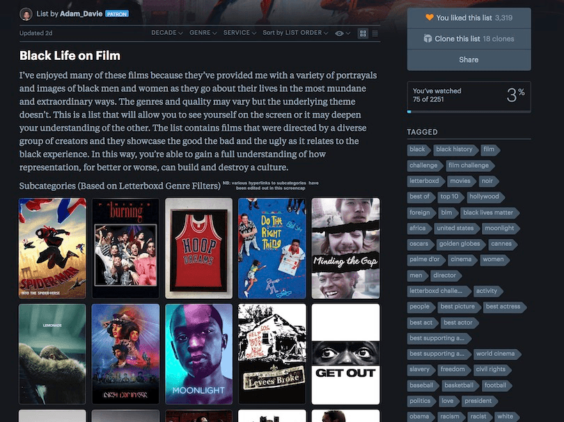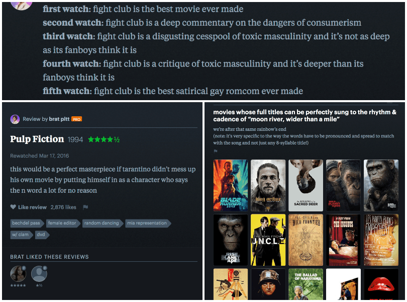 Mitigating the risk of myopia is the idiosyncratic community who’ve come to define the platform. “Online tool for film logging, amateur criticism, and list-making” sounds threatening, a dry blend of culture’s worst elements – the stuffiness and self-seriousness of magazine criticism, written by amateurs, saying whatever they want under cover of anonymity. Its closest filmic predecessor was the IMDB message boards – a place so competitive/hostile/toxically male that in 2017 IMDB closed them of its own volition, on the basis that they were “no longer providing a positive, useful experience for the vast majority” of users.