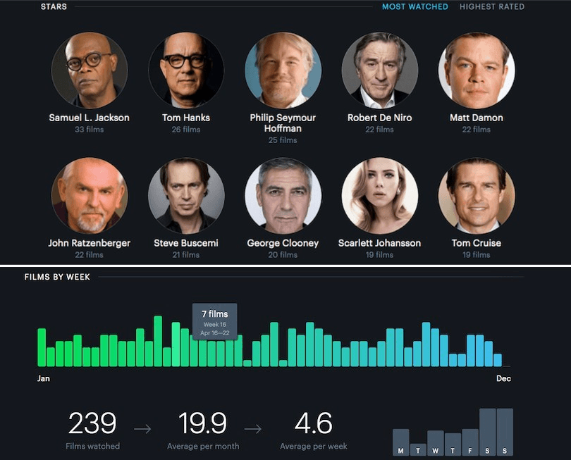 The same is true of one of my favourite features: the stats. For $NZ19 a year members get access to an ad-free version of the site along with stylishly rendered, comprehensive breakdowns of their own viewing data. Every question you could ever ponder has been answered — which actors you’ve seen most often, which directors you’ve rated most highly, how often you watch new films versus revisiting old ones — meticulously broken down year by year, genre by genre. In moderation it’s a powerful tool for discovery, granting users granular, actionable insights into their own tastes. And even for progress, exposing unconscious biases in both personal habits and the film industry at large. I don’t much like Tim Burton, but apparently I’ve seen 13 of his movies. The closest any female director (of narrative feature films) comes for me is six. But on a site that cheerily facilitates obsession, the personal spreadsheet can become a funhouse mirror, a tiny hit of the tech-enhanced cocktail of narcissism and neurosis that makes other social media so emptying.