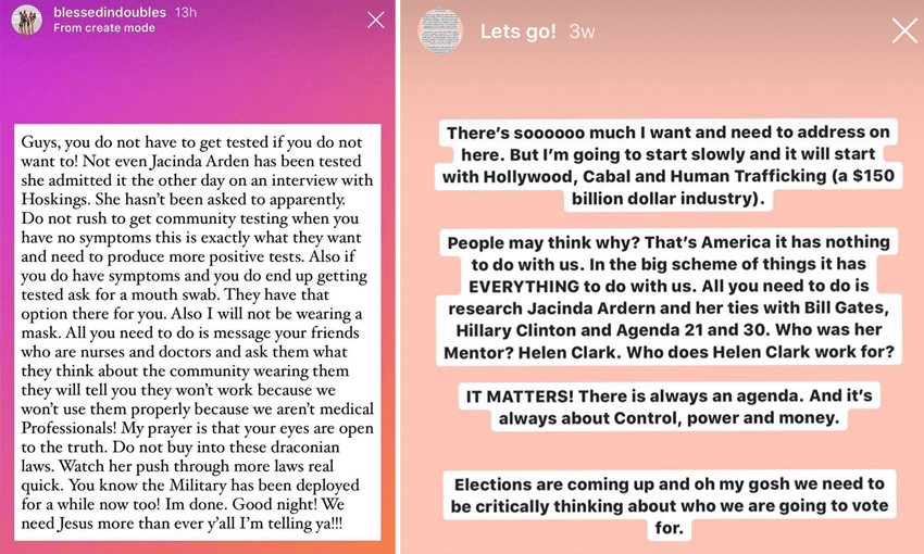 When the government announced Auckland would be moving into level three lockdown for the second time, Zoe Fuimaono took to Instagram to vent her frustrations over the government’s “draconian laws”. She urged others not to buy into it, to seek out the “truth”, and not get tested if they didn’t want to. She said wearing masks wouldn’t work because the public didn’t know how to wear them properly, and that medical professionals would agree (they don’t).